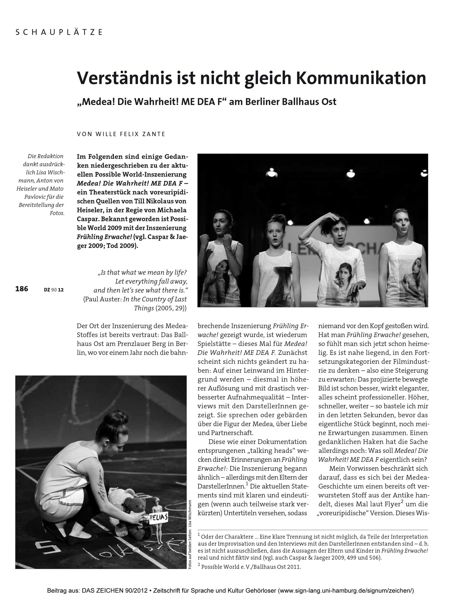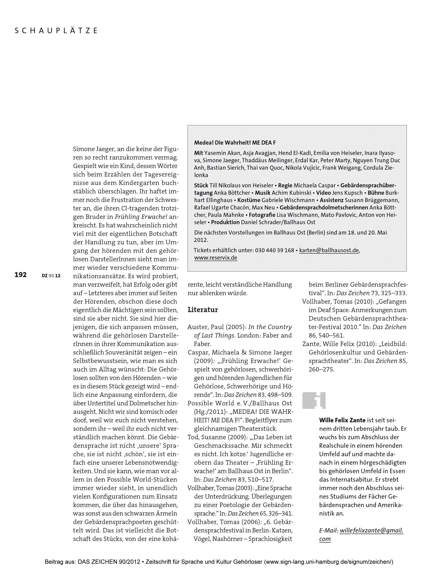 Das Zeichen: „Verständnis ist nicht gleich Kommunikation, MEDEA! Die Wahrheit! ME DEAF!“ Wille F. Zante DZ 90, 2012